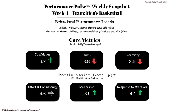 Unlike traditional mental skills programs, TTB provides real-time behavioral intelligence that shows exactly how mindset, recovery, leadership, and engagement are trending - week by week.
